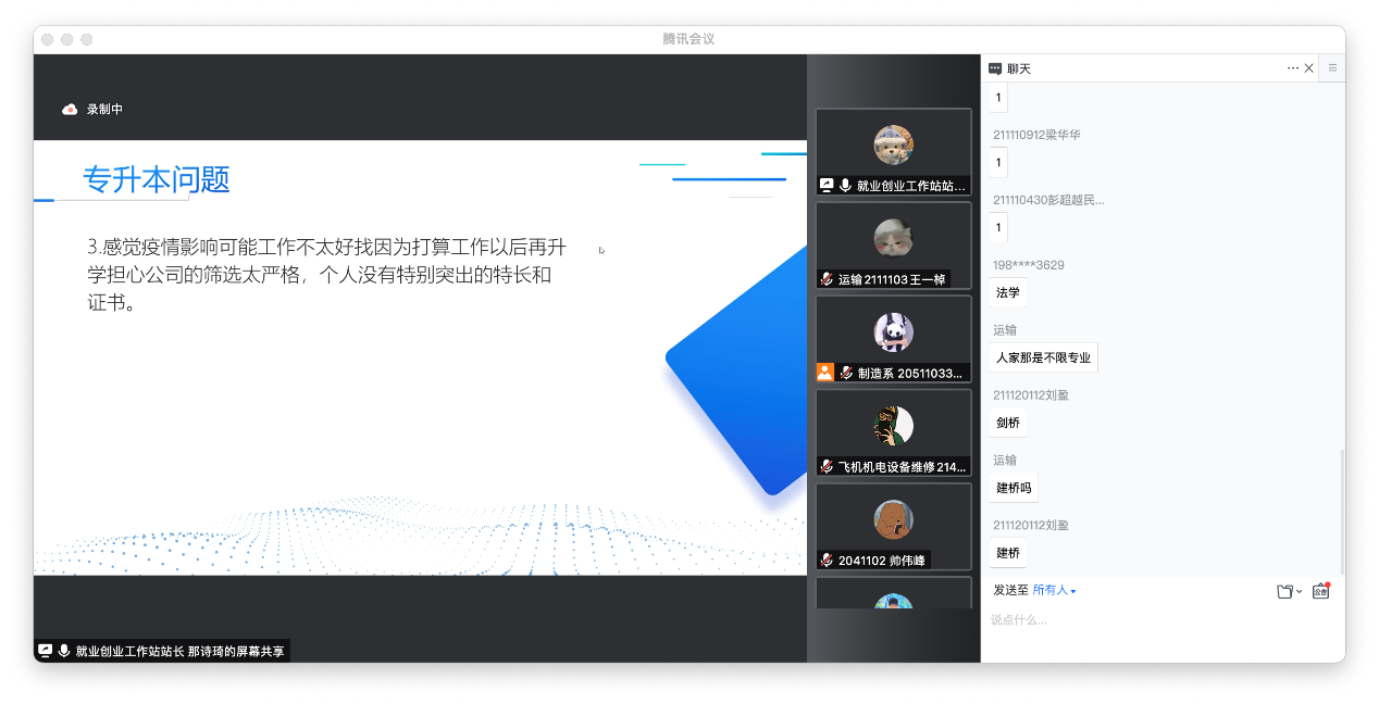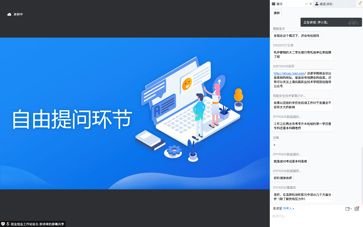 在自由提问环节,同学们相继提出了自己的困惑,老师们一一做出了细致的回答,鼓励同学们扎实提升自己的专业技能,让自己在专业技能方面更加出众。同时,就业指导中心的老师们肯定了部分同学们先就业再提升学历的想法,表达了先就业再择业,亦是为自身积累了更多的能力,而此也是对同学们未来职业道理的发展将会提供更多的可能。