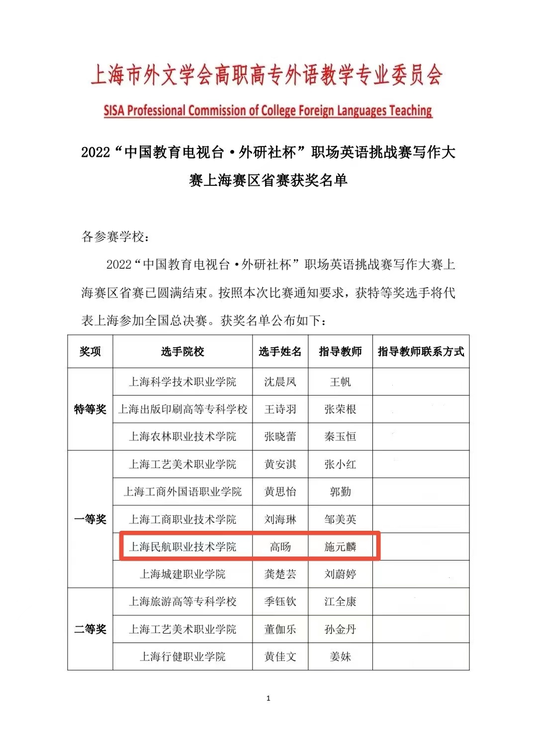 10月30日上午9点, 2022“中国教育电视台·外研社杯”职场英语写作大赛上海赛区的比赛正式拉开帷幕,此次比赛在上海工艺美术职业技术学院(徐汇校区)举行。比赛历时两个小时,经过专家近一周的评审和批改之后,近日比赛结果出炉。我院由外语教研室陆建英老师和施元麟老师指导的民航运输学院2111109班高旸同学、空港管理学院2131201班钟欣晨同学和民航维修学院2146101班徐文婷代表学院参赛,并斩获佳绩。高旸同学荣获上海市一等奖,另两位同学荣获上海市三等奖。