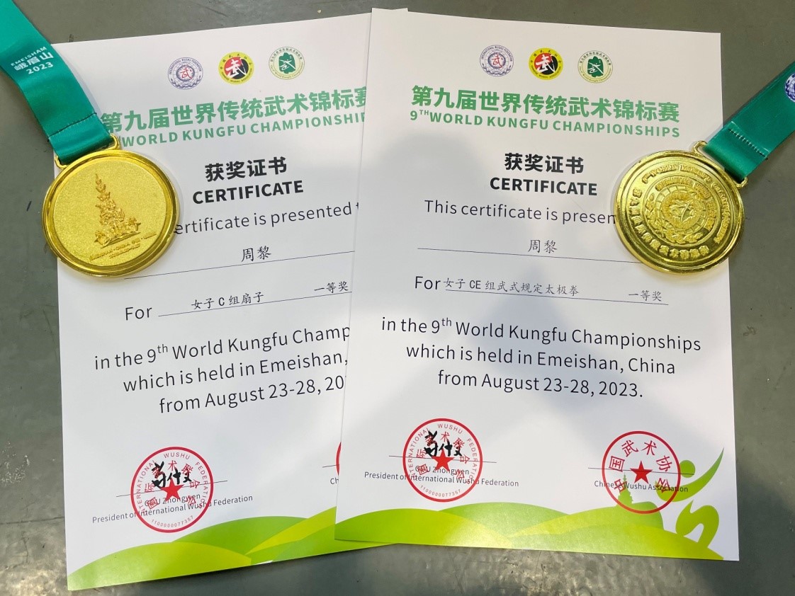 8月27日,由国际武术联合会、中国武术协会主办,以“慧定哦眉•武动世界”为主题的第九届世界传统武术锦标赛在四川省峨眉山市落幕。经历三天紧张激励的比赛,我院公共基础学院体育教研室周黎老师,代表上海市武术协会一举斩获大赛三项冠军,分别是女子C组太极扇第一名、女子CE组武式规定太极拳第一名、2人器械对练一等奖。