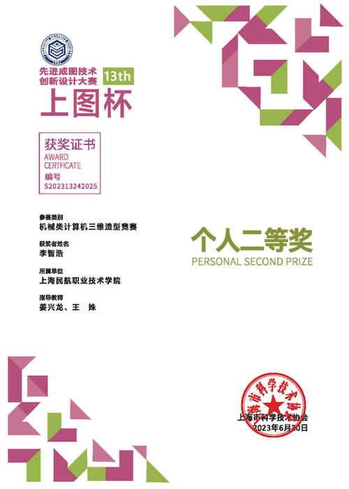 近日,第十三届“上图杯”先进成图技术与创新设计大赛大赛公布了比赛结果并进行了颁奖。我院大飞机学院组织学生首次参加三维赛道,在姜兴龙、姜克凯、王姝三位辅导老师的精心辅导下,最终2名同学获得个人二等奖。