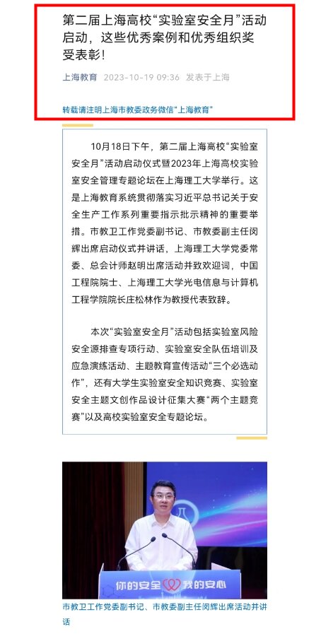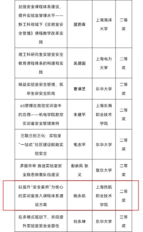 10月18日下午,第二届上海高校“实验室安全月”活动启动仪式暨2023年上海高校实验室安全管理专题论坛在上海理工大学举行。仪式上,对2023年上海高校实验室安全工作优秀案例和优秀组织奖进行了表彰,总结、推广高校实验室安全工作的优秀经验及做法。我院民航维修学院姚永凯老师撰写的“以提升‘安全素养’为核心的实训室准入课程体系建设方案”荣获上海高校实验室安全工作优秀案例二等奖。
