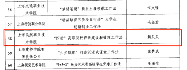 近日,上海市教育卫生工作委员会、上海市教育委员会公布了2022年度上海高校辅导员特色工作法名单(沪教委德〔2023〕29 号),我院民航维修学院辅导员魏贝贝申报的《“四新”高职院校班级建设和管理工作法》经学校推荐、材料审核、专家评审等环节成功入选。