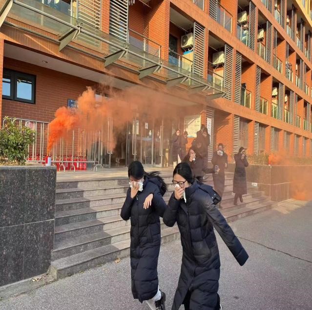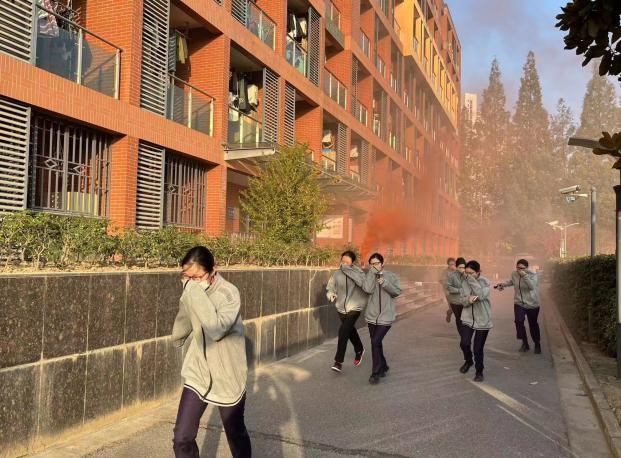 活动开始,现场指挥黄福磊老师向演习总指挥戴志刚书记报告演练前准备完毕,随着戴书记宣布演习开始指令,相关老师、教导员、沪杰保安、中航物业、学导员、安全员等人员迅速到达指定岗位组织疏散。15:40分随着一阵急促的警报声拉开了“应急疏散演练”活动的帷幕。同学们纷纷用湿毛巾轻捂口鼻,沿着指定楼梯口和安全出口指示标识指引路线快速疏散前进,400余名师生安全有序地从安全通道撤出宿舍楼并抵达了安全地点,总用时2分44秒。