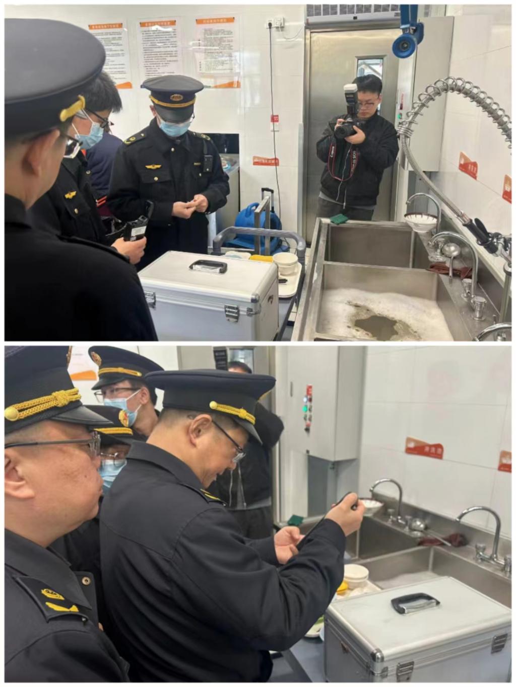 在此次飞行检查中,督导组一行详细了解了我院食堂的食品采购、储存、加工和配餐等环节的管理情况。现场仔细查看了食品储存设施的卫生状况及鼠(虫)害消杀防治情况,检查了食品的标签和有效期,还对后厨的操作规范、食品加工工艺和员工的健康状况进行了全面检查。在检查工作中,惠南镇市场监督所针对餐饮具清洗消毒等重点环节进行现场快检办公,对清洗消毒后餐具随机抽样快检,结果显示,我院餐具消毒合格可达重大活动保障微生物阈值。