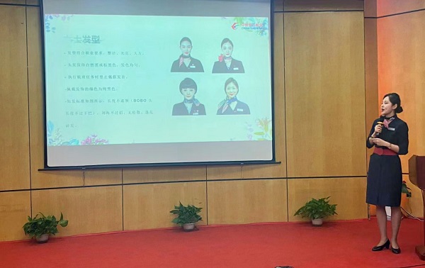 签约仪式结束后,东航青年代表李婉婷、杨昕媛为同学们带来《礼在东方 仪美客舱》微课程。两位团员青年通生动讲解东航乘务员对仪容仪表及仪态行为的规范要求,使在座订单学员深深感受到要想成为一名合格的乘务员,需要在今后的日常学习与工作需不断认真学习相关礼仪规范,提高自身综合素质,更好服务旅客。