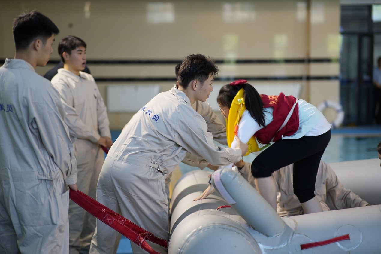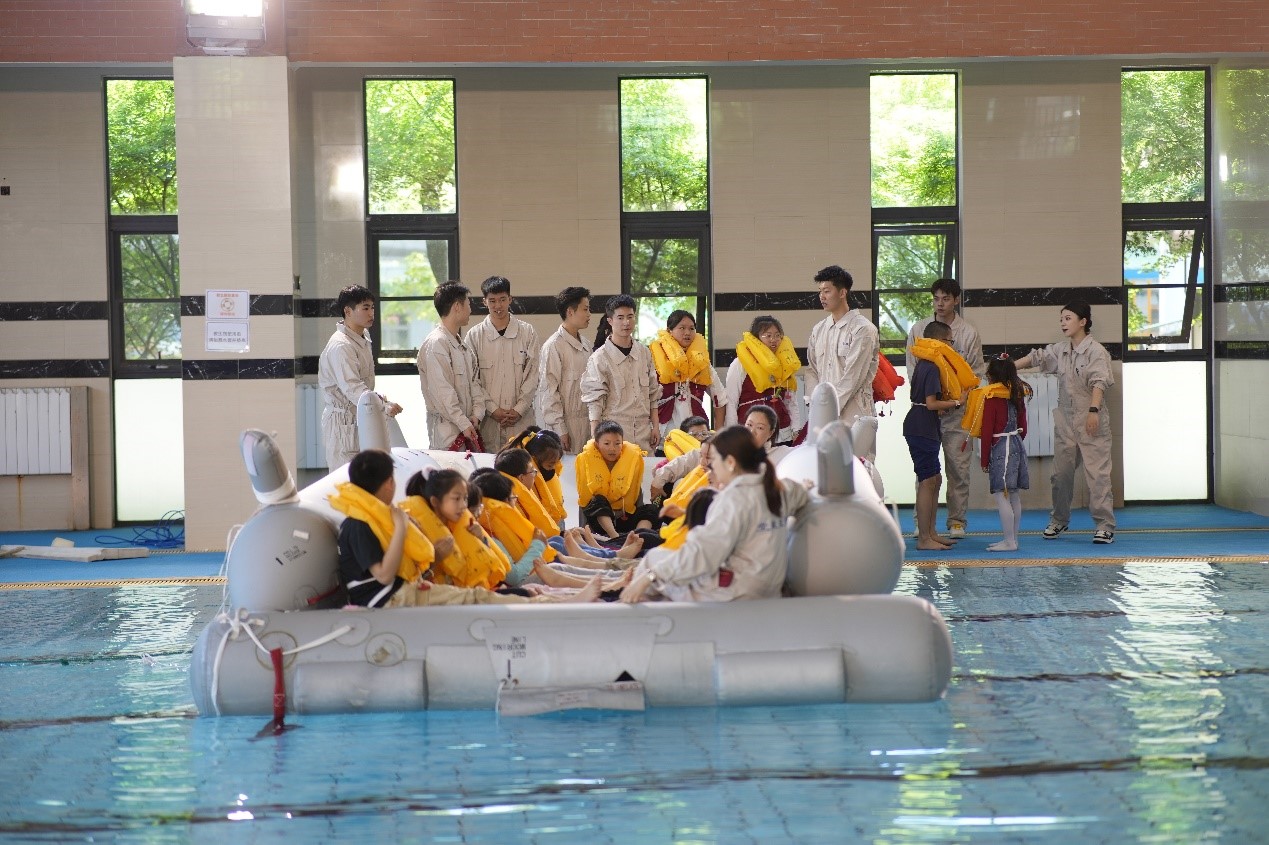 在7号楼泳池内的水上训练处由苏佳和包晓春老师介绍救生筏和相关的水上救生设备,随后志愿者指导体验者小同学们穿上救生衣,登筏,拖筏至游泳池对岸,在老师的帮助下真实体验了一场紧急迫降的水上逃生——登陆救生筏、在水上漂流、撤离救生筏。