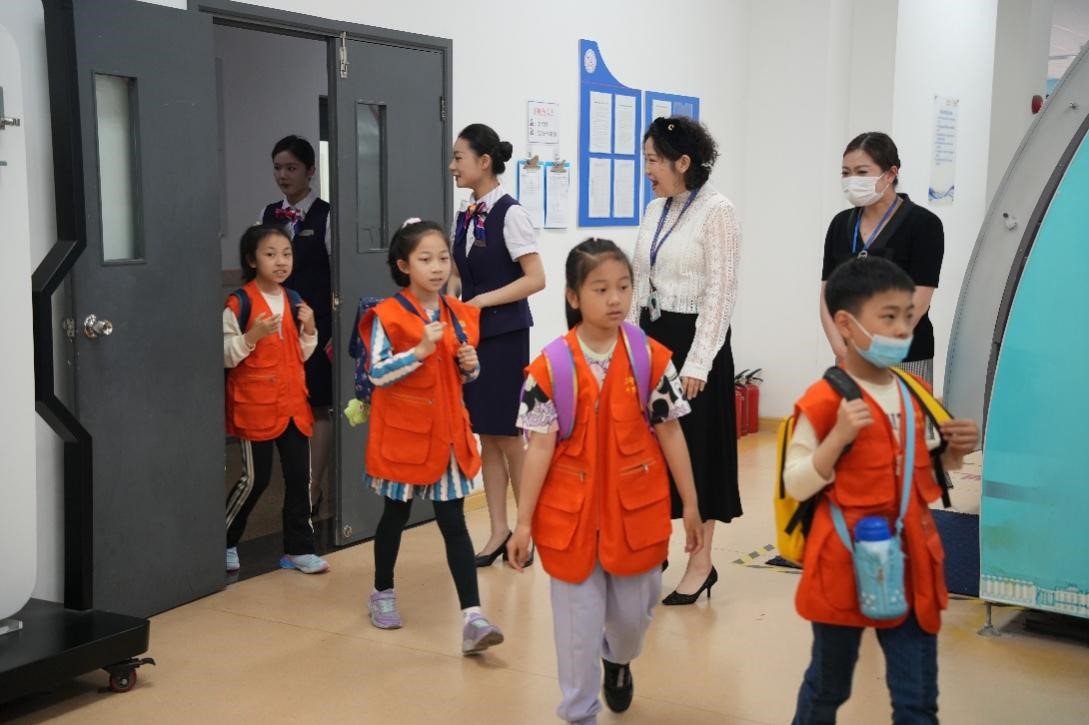 由包晓春和苏佳老师负责讲解和示范正确有效的跳滑梯姿势,在动态舱内向学生讲解客舱灯光和紧急灯光的区别,体验轻度、中度及重度三种不同程度的颠簸和高空骤降的感受,引来小朋友们尖叫声连连;体验空中释压、空中烟雾起火的状况,在飞机着陆后,应急门打开后在老师的指导下,用刚刚学会的标准跳滑梯姿势,勇敢地通过充气滑梯进行紧急撤离。