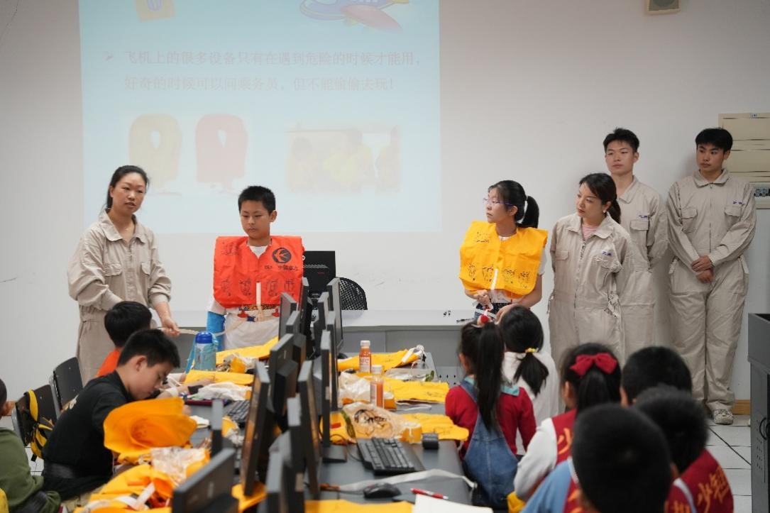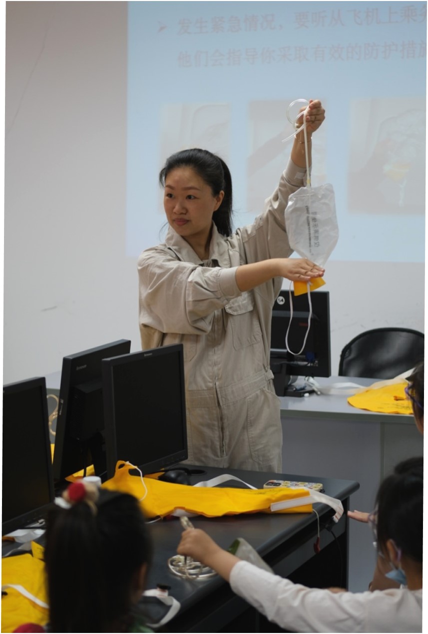 上午9:30分,在航服实训中心407教室,包晓春老师向大家做了《乘机七件事》的介绍。让同学们了解到安全带的正确使用方法以及紧急情况下氧气面罩和救生衣的用法。学院为每位同学都准备了一套设备可供练习,在老师以及志愿者同学的指导下,让孩子们了解及练习操作穿戴安全带、氧气面罩和救生衣。