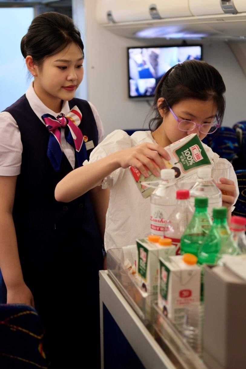 在理论知识介绍结束后,在B738静态模拟舱里,王燕萍和张滢老师负责讲授机上服务流程,介绍如何欢迎旅客登机、安全演示示范,并手把手地教体验者们推着服务餐车为旅客递送点心和饮料体验。让孩子们以乘务工作者的角度体验平日乘务员在飞行过程中的服务流程及服务需要警惕的注意事项。