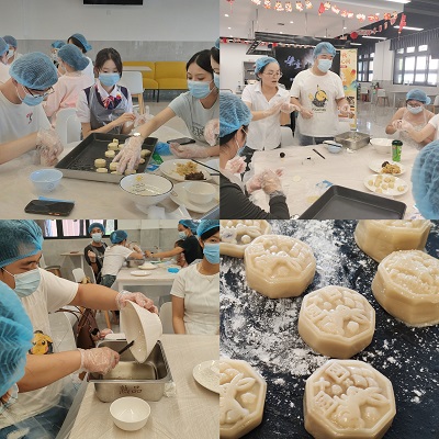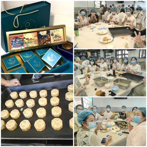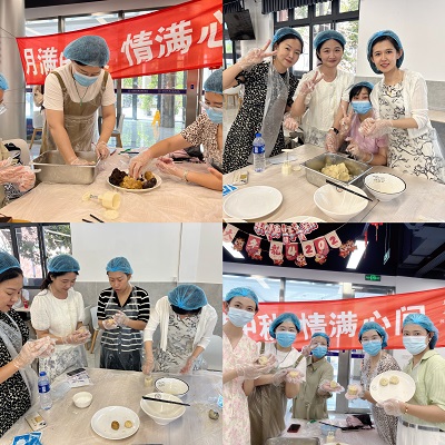 在活动现场,桌上摆满了由苏州工业园区科桥餐饮服务有限公司精心为大家准备的各种制作月饼的材料和工具,在面点师傅的指导下,现场热火朝天地进行着各道工序:大家将面粉与水,油,糖浆等按照比例混合揉成面团,再将面团制成饼皮,然后包上香甜的馅料,最后用模具将月饼压出各种精美的形状,有文字雕花,也有可爱的卡通动物图案。随着各式月饼“新鲜出炉”,现场弥漫着欢乐的气氛。