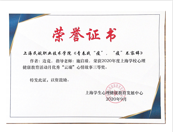 边竟同学荣获上海市优秀“云端”心情故事三等奖