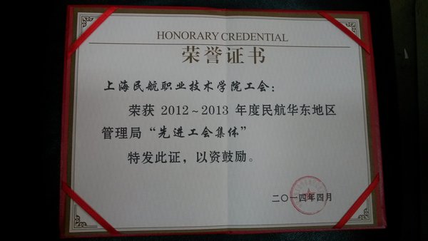 学院工会荣获“2012-2013年度民航华东地区管理局先进工会集体”荣誉称号