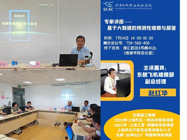 为加强学科建设,助力民航维修学院科研高质量发展,7月14日下午,民航维修学院特邀“2023年上海市五一劳动奖章”获得者、现任东航技术公司飞机维修部副总经理、正高级工程师赵红华专家来院开展“基于大数据的预测性维修与展望”的学术交流研讨活动。本次讲座由民航维修学院副院长王志豪主持,维修学院在校教师参加了现场研讨,其余老师通过线上直播的形式参与学习交流。 赵红华自2016年以来带领东航MCC大数据研发团队创建以预....