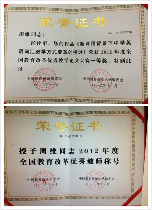 外语教研室周维老师获得“2012年全国教育改革优秀教师称号”